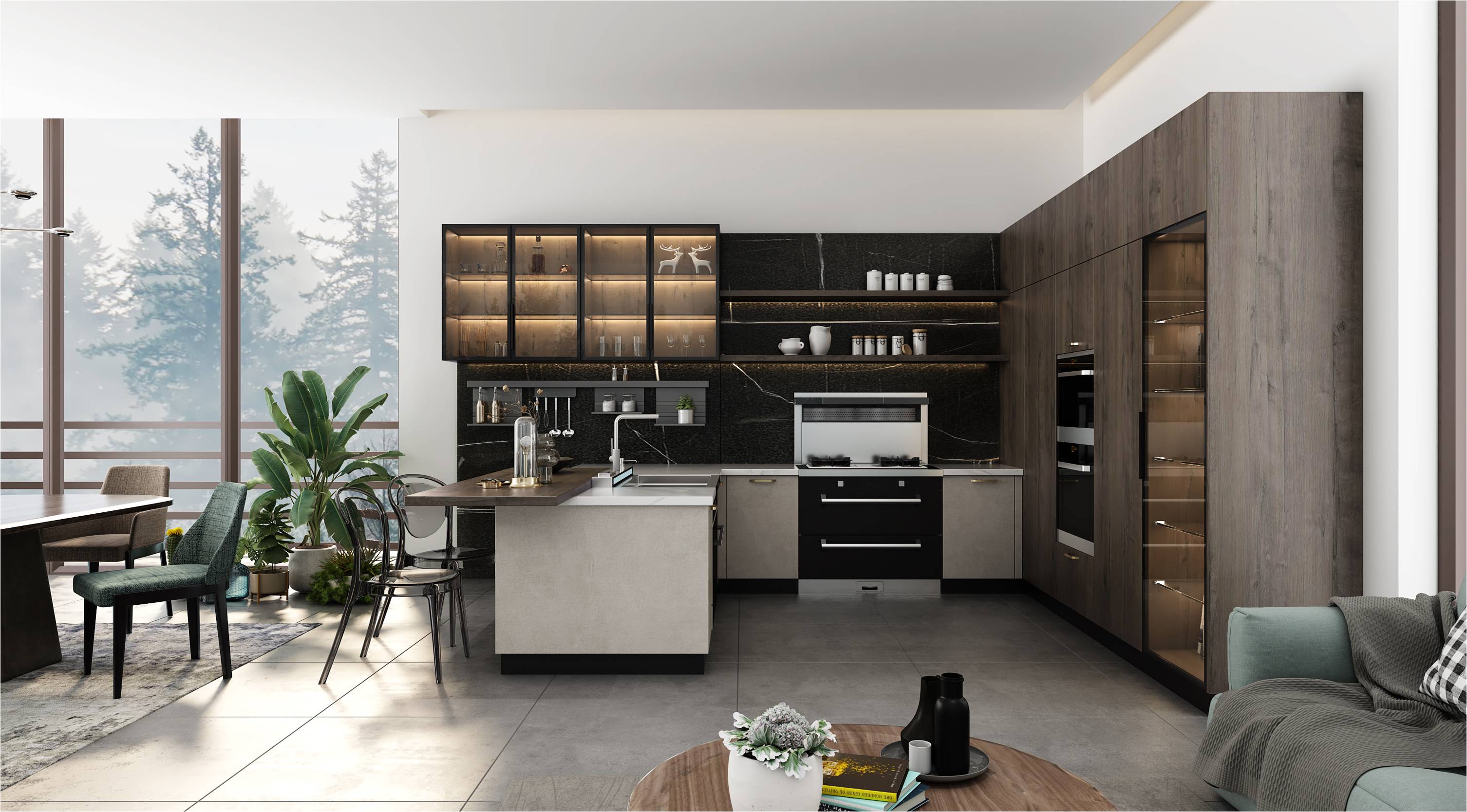 豎形的木材紋路與顏色,好似把整個叢林搬進了家里。自然的氣息充滿了廚房。