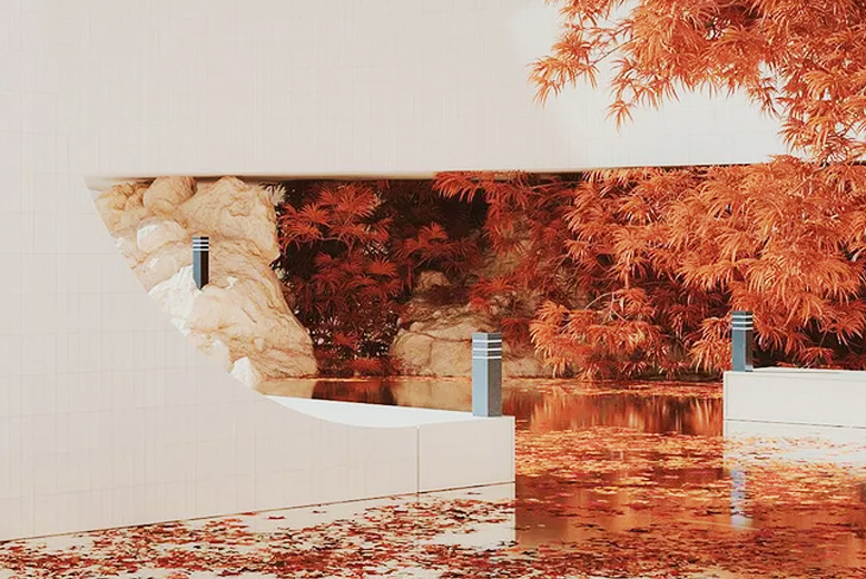 采用白色紋理石材,純正的白色如冬季的雪山。 石材的紋理猶如白雪覆蓋的雪山中露出星星點點的植被。