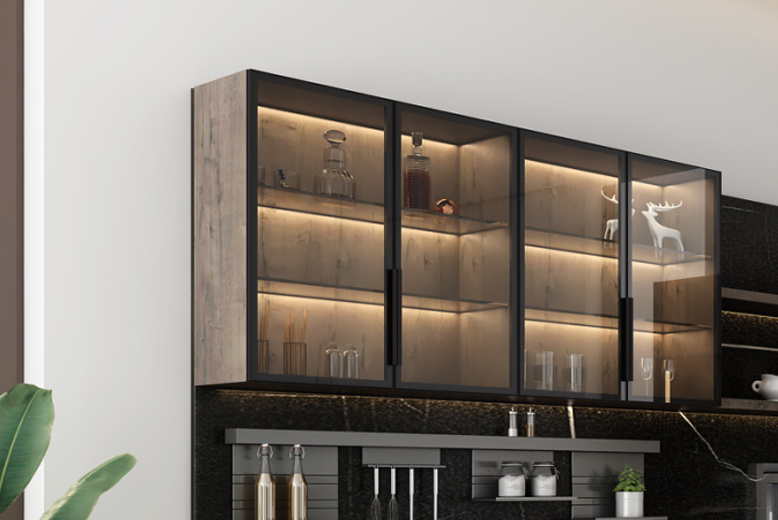 黑色邊框的玻璃門內,隱隱透出溫暖的光,陳設品若影若現。光影效果使空間更富有層次感。